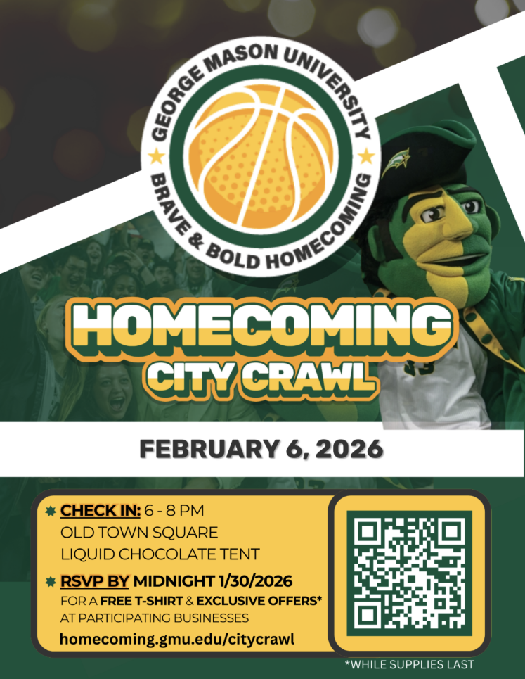 Kick off Homecoming weekend with our City Crawl! In partnership with the City of Fairfax and the annual Chocolate Festival, this evening event invites Patriots and community members to explore 10 participating Old Town locations, each offering special deals on food and beverages for registered Crawlers.