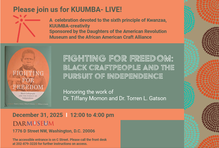KUUMBA-LIVE! is part of the closing events for Fighting for Freedom: Black Craftspeople and the Pursuit of Independence, the groundbreaking exhibition organized by the DAR Museum in partnership with the Black Craftspeople Digital Archive (BCDA). Curated by William Strollo, Dr. Torren L. Gatson, and Dr. Tiffany Momon, KUMBA-LIVE will honor Dr. Gatson and Dr. Momon, creators of the BCDA.