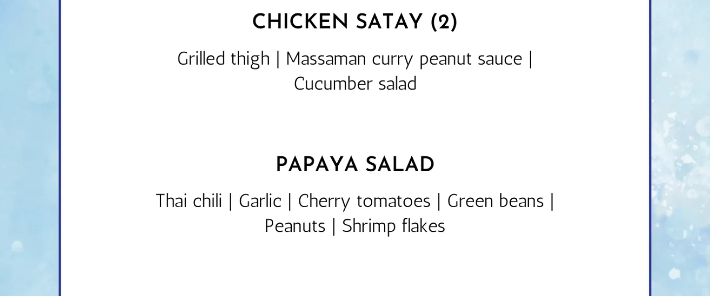 Savor the season with Mama's Winter Platter for $65 per person. Each platter contains: 2 Spring Rolls, 2 Chicken Satay, Papaya Salad, Tom Yum Seafood Soup, and Mango Sticky Rice.