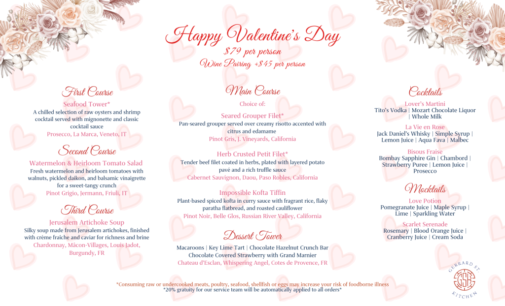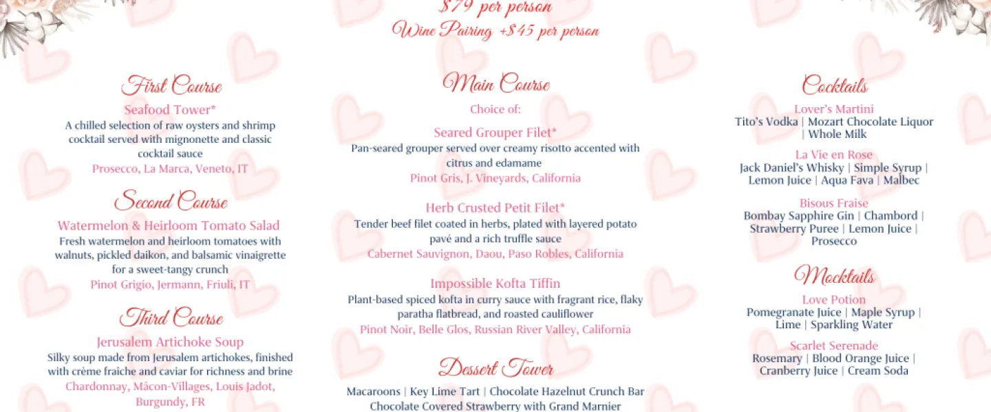 Indulge in an unforgettable Valentine’s Day experience with our exclusive five-course prix fixe dinner, thoughtfully crafted to celebrate romance in every bite. From the first sip to the final decadent dessert, each course blends passion and flavor, showcasing seasonal ingredients, artful presentation, and a touch of culinary magic. Whether you’re toasting new love or rekindling a timeless connection, this candlelit evening promises to be as elegant and unforgettable as the one you share it with. To book: OpenTable - Choose a time for your experience