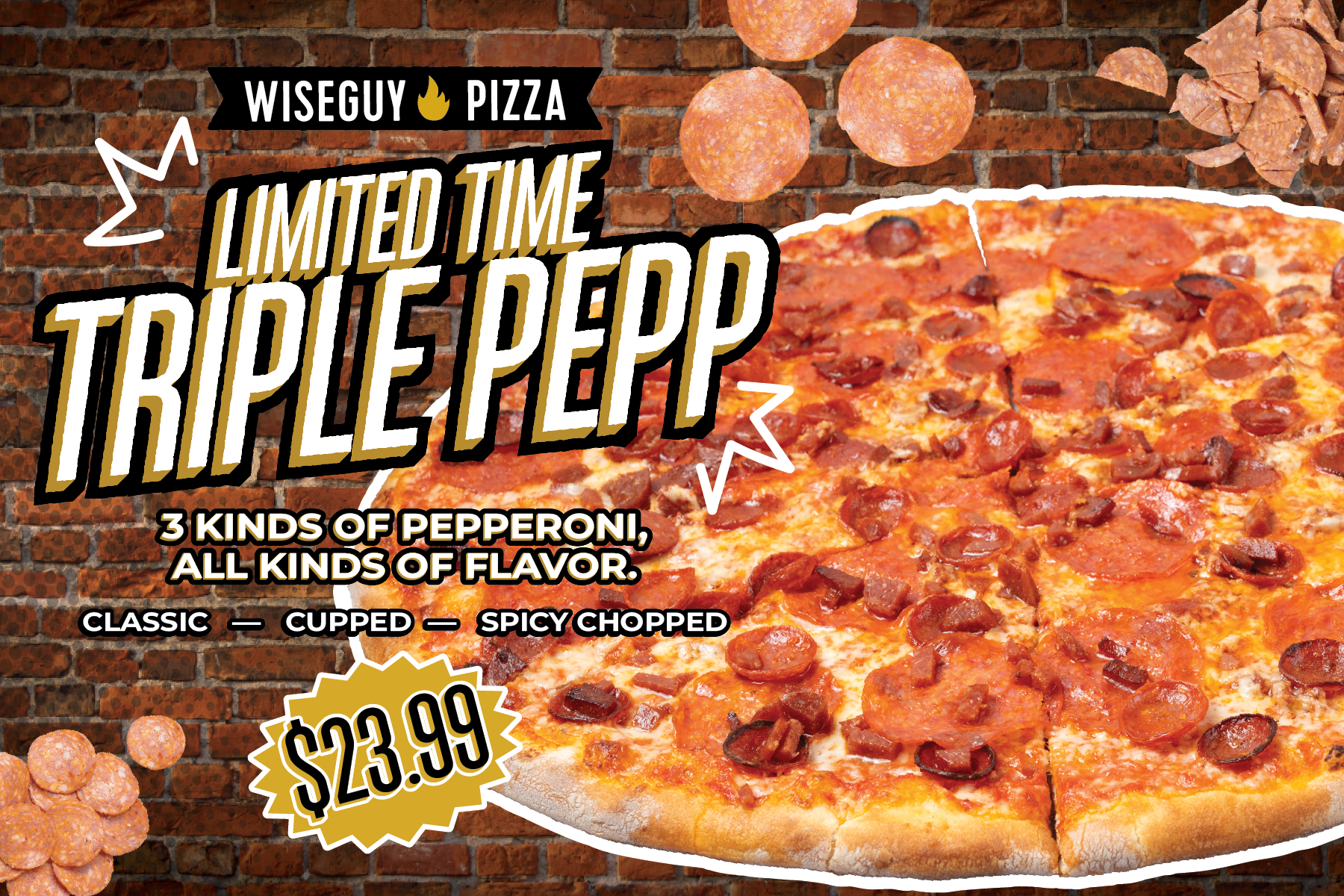 Wiseguy Pizza is known for their New York Style, authentic pies characterized by distinct chewy, golden crust perfected in classic, stone deck ovens.