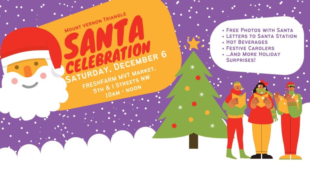 Join the MVT CID at the FRESHFARM MVT Market (5th & I Streets NW) on Saturday, December 6 from 10am-Noon when I Street transforms into Santa Claus Lane with a visit from the Big Man himself! Bring the kids, your pets, or just yourself to take a photo with Santa, write a letter to the North Pole, sip on a warming beverage and enjoy the festive sounds of live carolers while shopping local produce and goods at the MVT FRESHFARM Market.