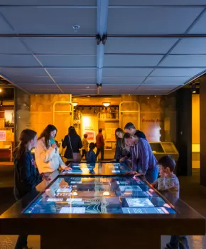 People gathered around table in National Archives